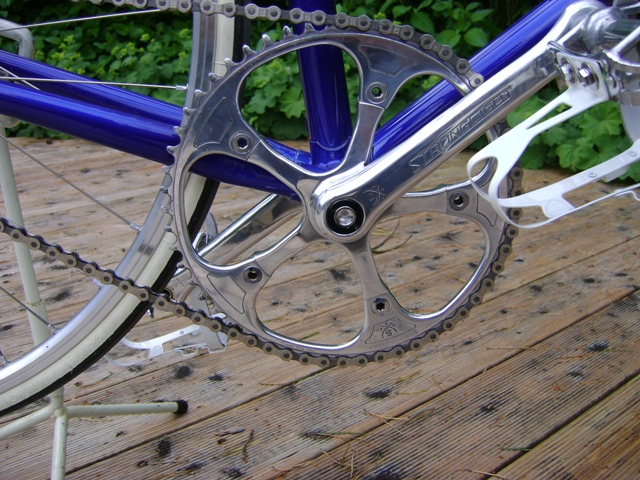 Das Herzstück des Antriebs. Fette Stronglightkurbel mit 54 Zähnen an der Kette. Umbau auf