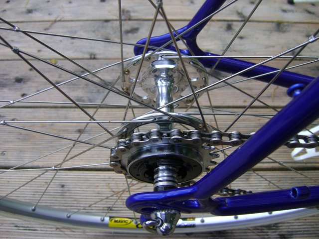 Blick von der rechten Seite auf den Antrieb. Shimano Freilaufritzel in verchromter