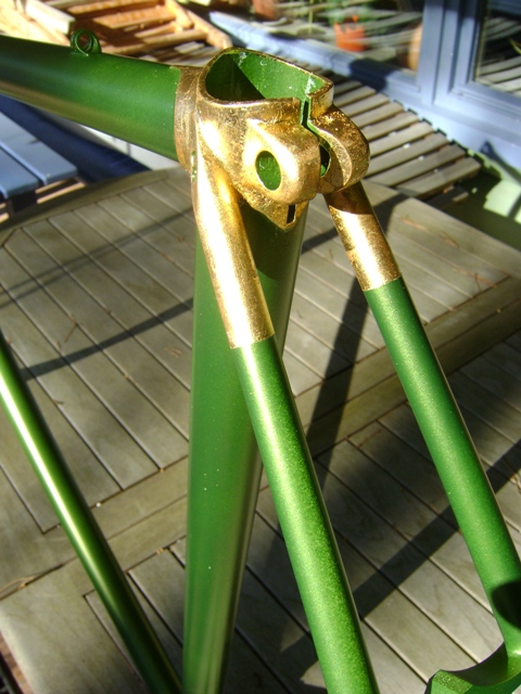 Detailansicht der Sattelmuffe nach aufbringen des Lacks und der echten Blattvergoldung.