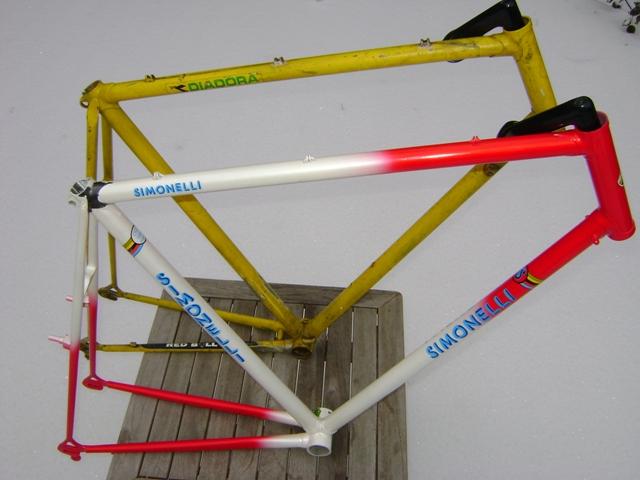 Hier die Ausgangsbasis. Im Vordergrund der Simonelli Rahmen in der Serienfarbe, dahinter der Bridgestone der hier