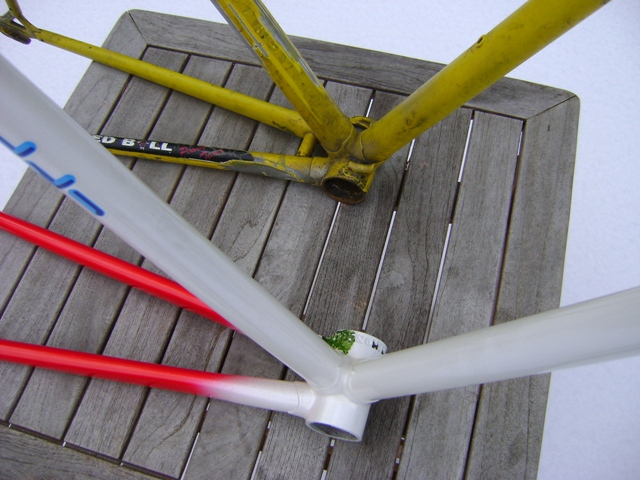 Nochmalige Detailansicht der alten Stahlrahmen. Der Simonelli ist ein NOS Teil, der Bridgestone ist stark gebraucht.