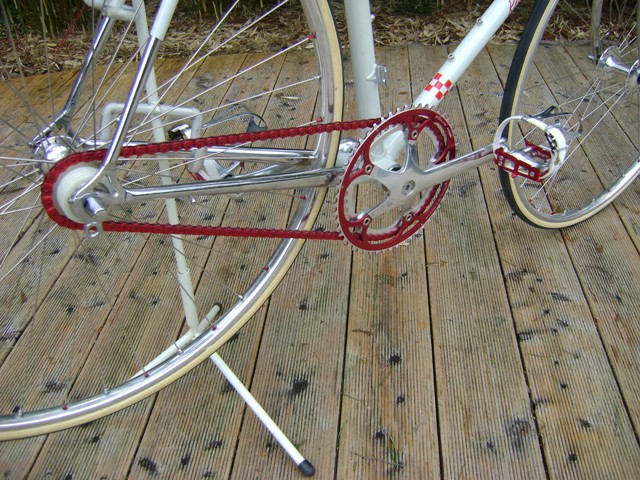 Schöner, auffälliger Antrieb, bestehend aus alter Campa Recordkurbel und TA Kettenblättern. Das Große