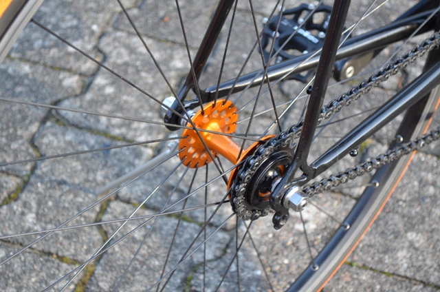 Nabe. Diese wurde auf Rennradbreite ausdistanziert.