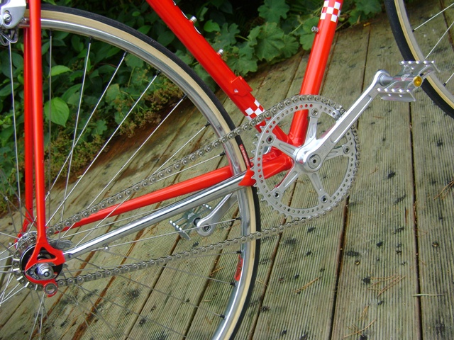 Blick auf den fertigen Antrieb. Campagnolo GS Kurbel mit gelochtem 46erSugino Kettenblatt. Verschliffen, zur Verdichtung