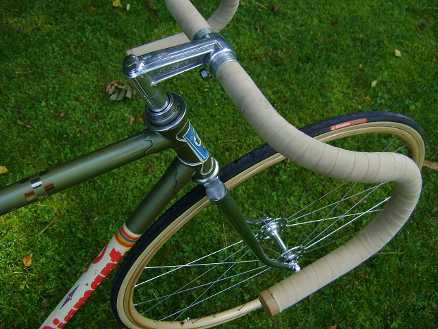 Blick auf den schönen alten Scheeren Vorbau und den passenden Lenker mit samtartiger Lenkerwicklung wie sie früher auf der Bahn auch üblich war. Steuersatz