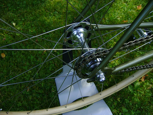 Schau mit aufs Ritzel Kleines! Hier natürlich als FIX Version auf alter Campa Pista mit den schönen CB Holzflegen. Halflinkkette ist dann