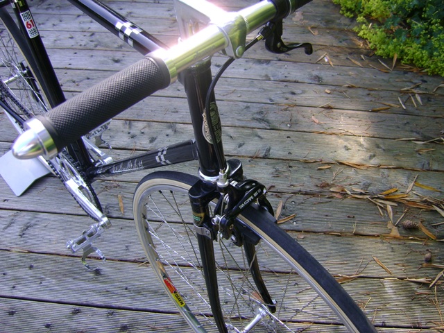 Bremshebel. Die Bremse ist eine spezielle Konstruktion für Bahnradgabel und wird direkt an den Gabelscheiden verschraubt.