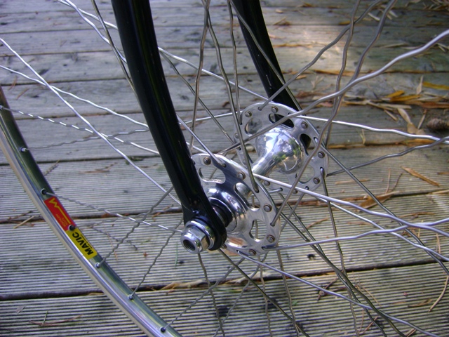 Nochmals ein Blick ins Vorderrad. Erstklassig aufgearbeitete Zeus Bahnnabe mit Wellenspeichen