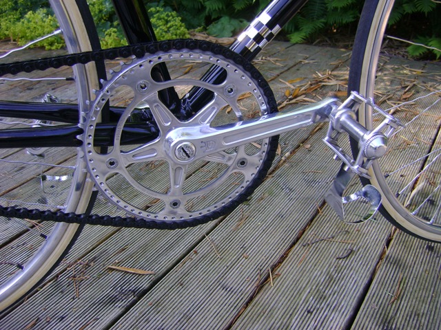 Hier wird gekurbelt - Kette rechts sowieso. Schöne alte Sugino Bahnradkurbel, abpoliert,
