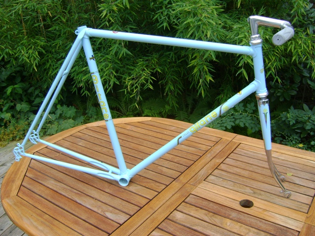 Der Rahmen hat nun Aufkleber und Klarlack. Die Muffen werden noch gerandet. Stronglight statt Campa Steuersatz,