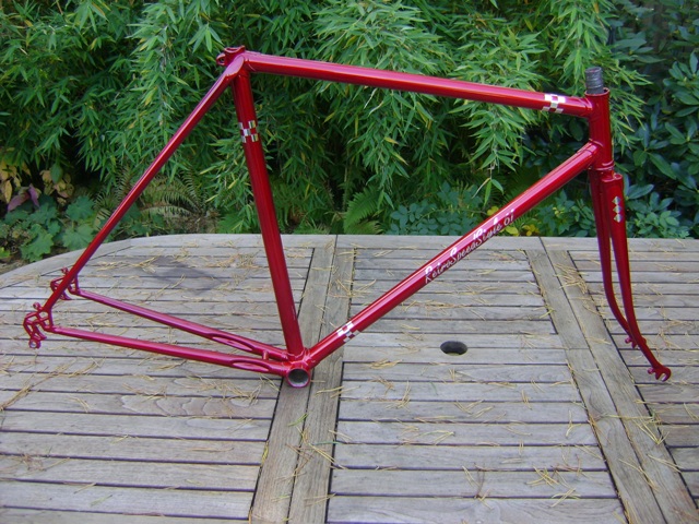 Der Rahmen ist nun zurück von der Pulverbeschichtung. Lasurrot kommt dem verblichenen Orginallack sehr nahe, und sieht schön
