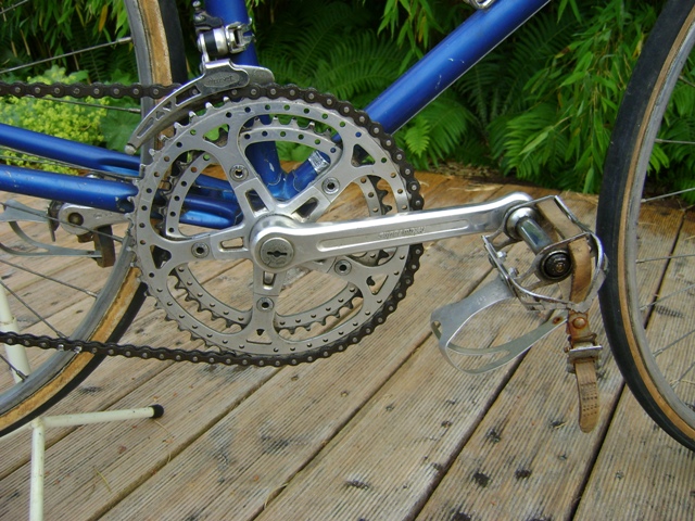 Schöne alte Suginokurbel, perfekt gelocht auf einem französischen Innenlager montiert. Trotz