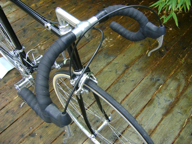 Die Lenkzentrale mit klassisch rundem Rennlenker wie er schöner nicht sein kann. Vorbau abpoliert, neuer