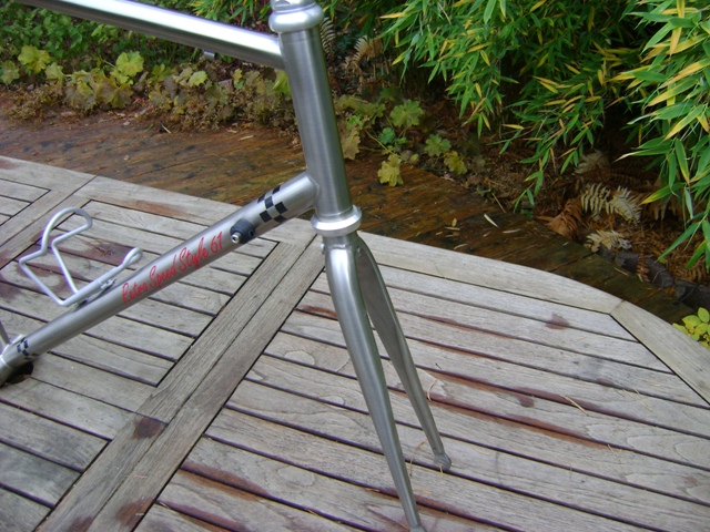 Die Front mit filigraner, messerscharfer, gerader Gabel. Steil und hart. Steuersatz ist schon eingepresst, zuvor plangefräst