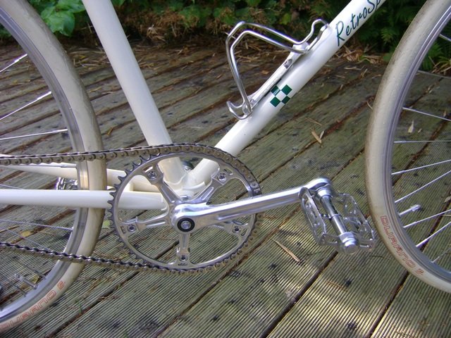 Schöne Campa Strada Kurbel, alte NOS Lyotard Pedale und Halflinkkette in chrom. Veloce Innenlager damit auch