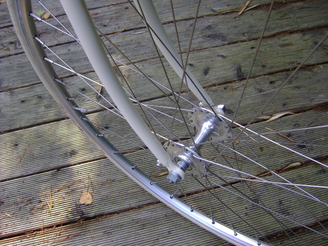 Blick ins Vorderad. Alte NOS Suzue Nabe mit Schraubachse. Hoher Flansch, dreifach gekreuzt und mit
