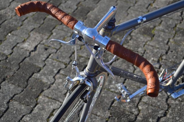 Die Lenkzentrale - kurzer Cyclo Lenker mit Lederband bewickelt. Die kleinen Sunhebel