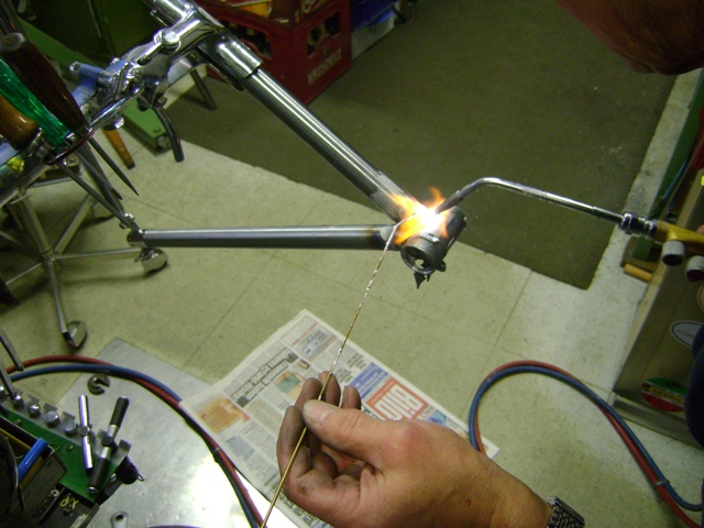Ein Eindruck vom löten. Mit weicher Flamme wird unter der Nutzung von reichlich Reynoldsflussmittel das Messinglot eingebracht.