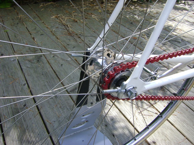 Blick von rechts auf den Antrieb. 16er Freilauf - schöne rote Kette und alles stramm gespannt.