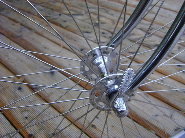 Schöne aufpolierte Suzue Nabe, radial gespeicht - wie immer mit U-Scheiben - mit einer aktuellen Mavic-