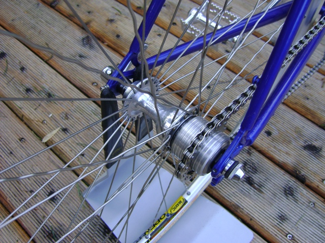 Einblick in das ungewöhnlich aufgebaute Hinterrad. Eine Seite glatt radial gespeicht und die