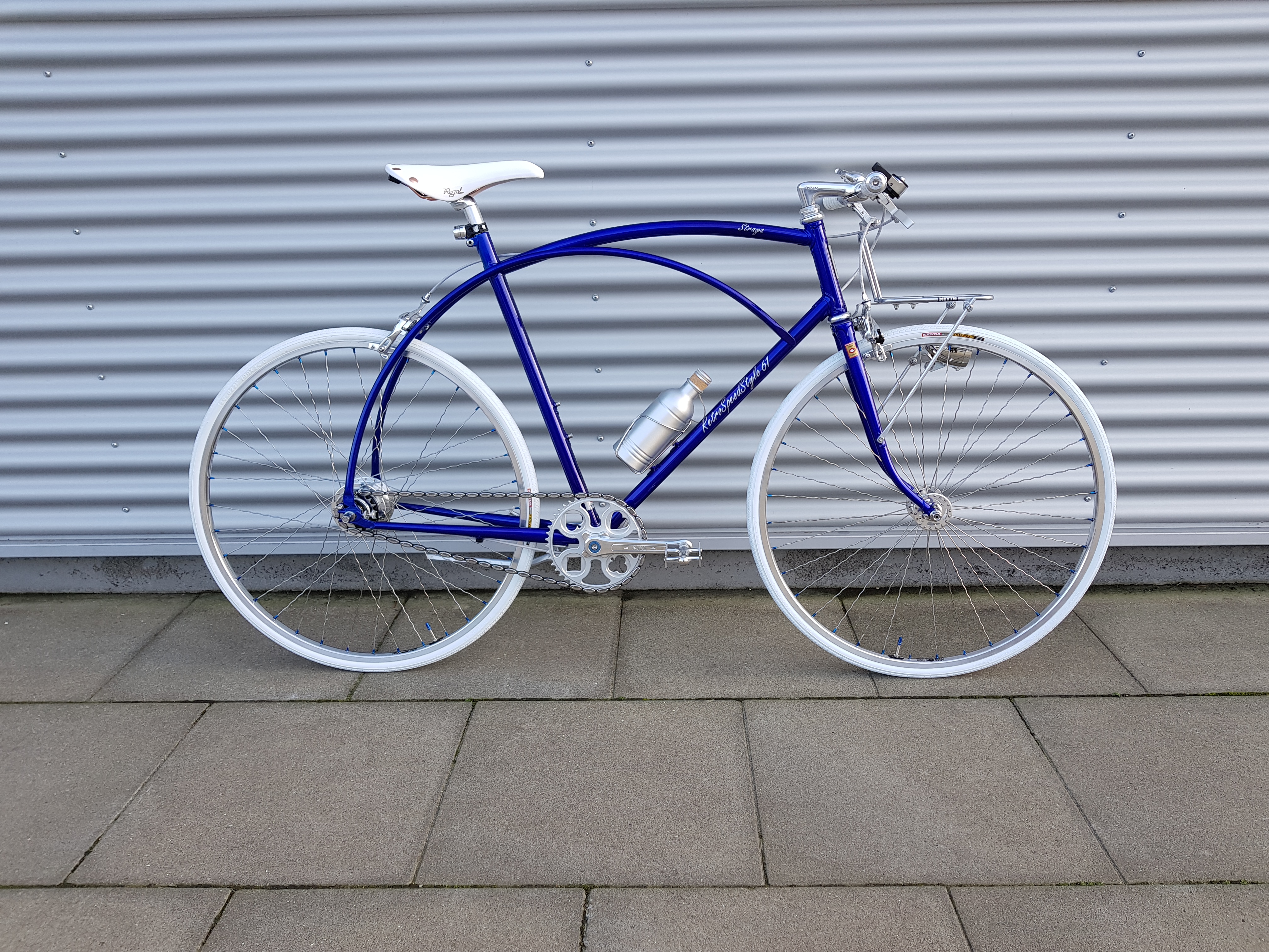 Der „STRAYA“ Rahmen in lasurblaumetallic, COLUMBUS Rohre, handgelötet mit „fleur de lys“ Muffen, 20 Jahre Garantie auf Rahmen und Gabel, dreifach gepulvert, RIGIDA Felgen hochglanzpoliert, STURMEY rotary 5 Gang, V2A Wellenspeichen dreifach hinten, vorne radial gespeicht mit U- Scheiben, blaue Alunippel. Die Räder sind handgebaut. KENDA Sportreifen in weiß mit CONTI Schläuchen, luxuriöse PAUL ROYAL FLUSH Kurbel, intergrierter Abzieher, IRD Innenlager mit Alucaps, TECORA Lenkkopf Lager,